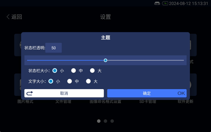 主题设置:可调节主界面状态透明度,以及状态栏大小,还有全局文字大