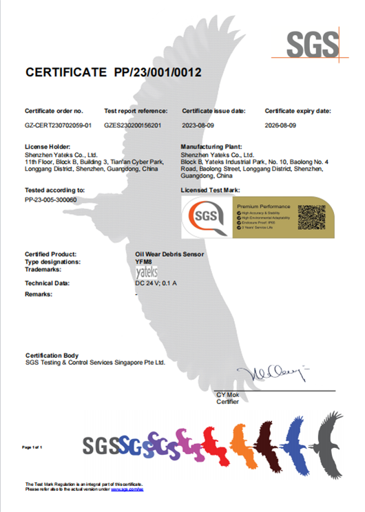 标定和量的索源是油液监测的保证亚泰光电拥有完善标定仪器的油液实验室,油液传感器经过获得标准样品、设置标准样品、测量标准样品、校准传感器、验证标定结果、记录标定等步骤,最终获得高准确度的油液传感器。亚泰光电和sgs达成了深度战略合作,金属磨粒检出率可达95%以上,获得了sgs颁发的全球首张传感器性能金标认证(sensor trust)。