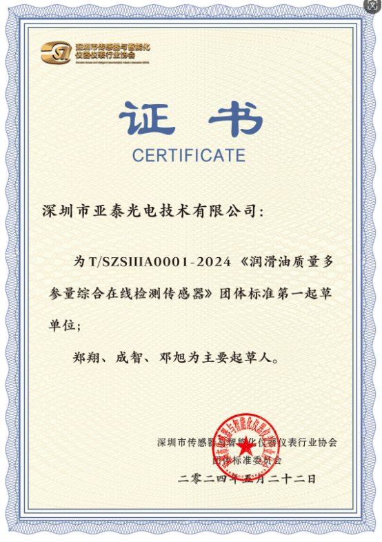 在《深圳市培育发展智能传感器产业集群行动计划(2022-2025年)》的指导下,传感器企业越来越成为深圳国民经济和社会发展的新质生产力,但与此同时,在润滑油在线检测传感器领域并没有具有针对性的指导标准。亚泰光电牵头起草全国首个油液监测传感器器团体标准(t/szsiiia0001-2024),已实施并出版(由中国标准出版社出版发行,各地新华书店经销)。这是对深圳市亚泰光电技术有限公司和相关润滑油状态监测传感器企业提出了更高的要求。它将推动传感器技术的创新、促进润滑油行业的数字化转型、加强行业间的合作与交流,并提升我国在全球润滑油市场的地位。随着标准的深入实施和应用,相信我国润滑油行业将迎来更加广阔的发展前景。