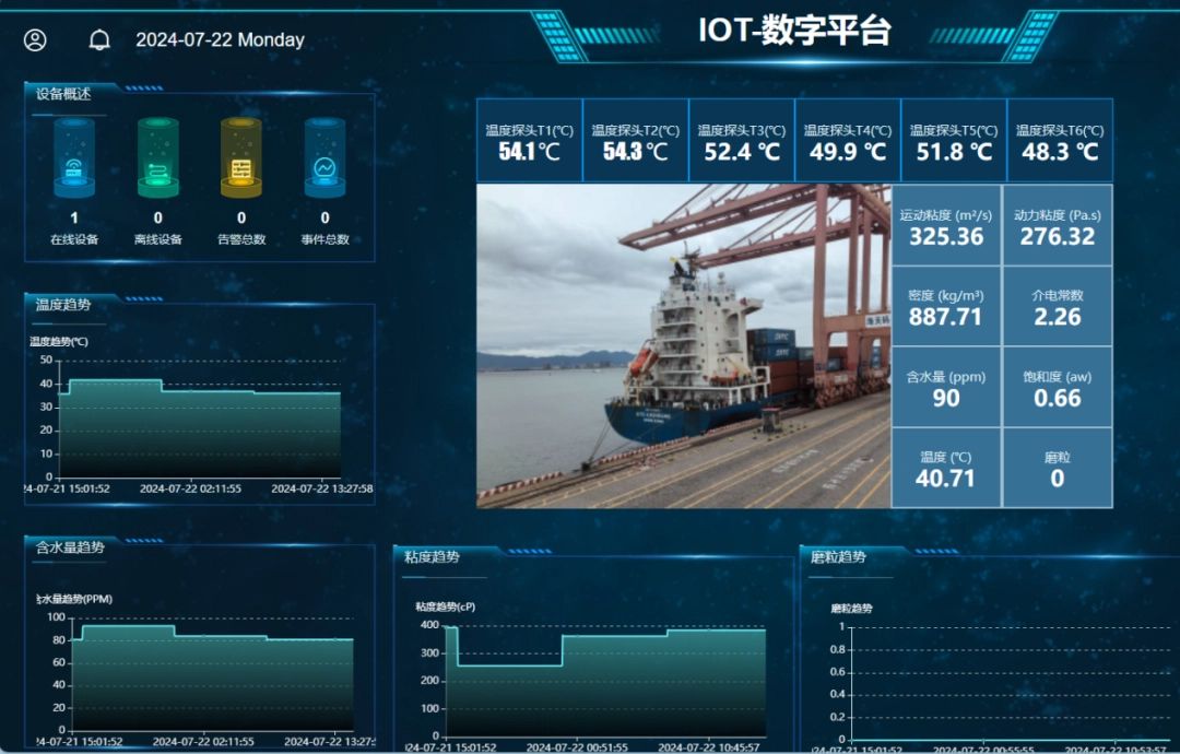 油液被誉为设备的“血液”。油液监测系统通过在岸桥关键部位(如起升/俯仰/小车行走液压站、大型减速齿轮箱、柴油发动机/发电机组)部署在线传感器或结合实验室精密分析,7x24小时守护设备健康。