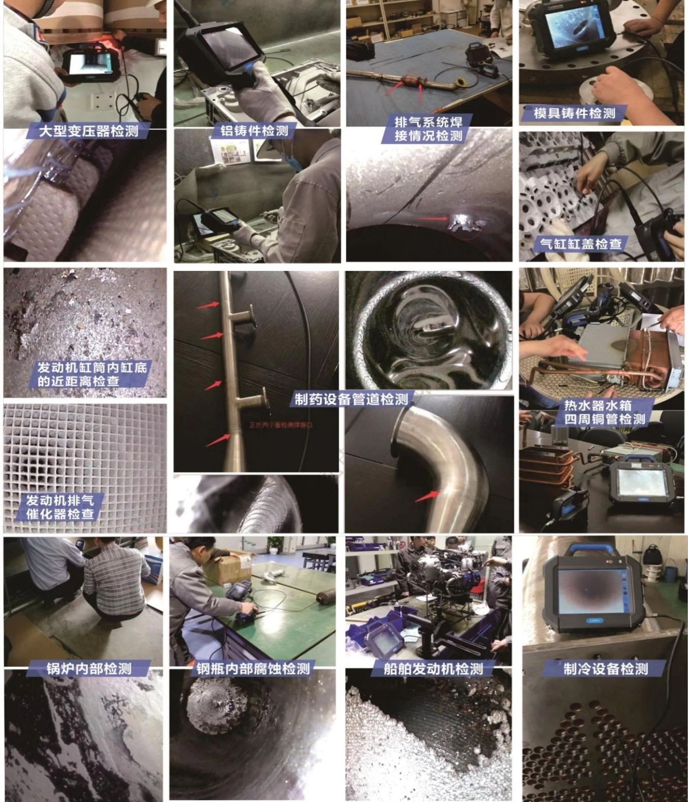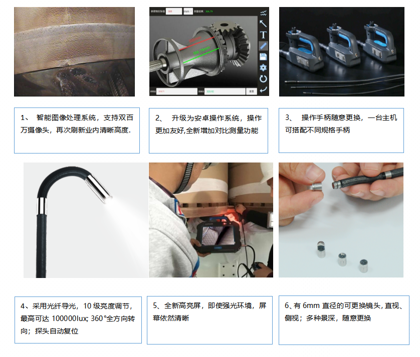 本仪器广泛应用于航空、汽车、船舶、电气、化学、电力等现代核心工业生产、检修等多个环节。具有直接可视的特点,能够直接观测管道、涡轮、汽缸、发动机等大型装置内表面是否存在缺陷或异状。可进行实时拍照和视频录制,为分析设备使用状况及设备生产保障提供不可或缺的数据采集。