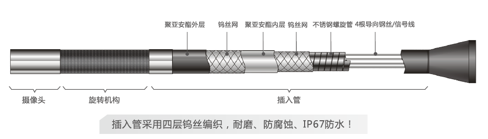 l插入管材质——插入管材质为四层钨丝编织耐磨管,防水等级ip67,长度可定制。